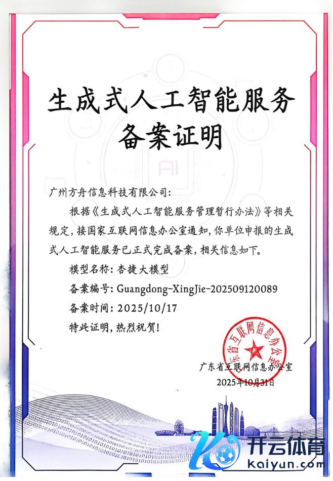 日前,“AI+慢病治理”头部企业方舟健客(HKEX:06086)自主研发的AI超等大脑——“杏捷大模子”在国度网信办完成生成式东说念主工智能奇迹备案(备案号:Guangdong-XingJie-202509120089)。10月31日,“备案赋能粤创将来”广东省备案大模子发布会(第一期)在深圳见效举行,方舟健客获颁发“生成式东说念主工智能奇迹备案阐明”。