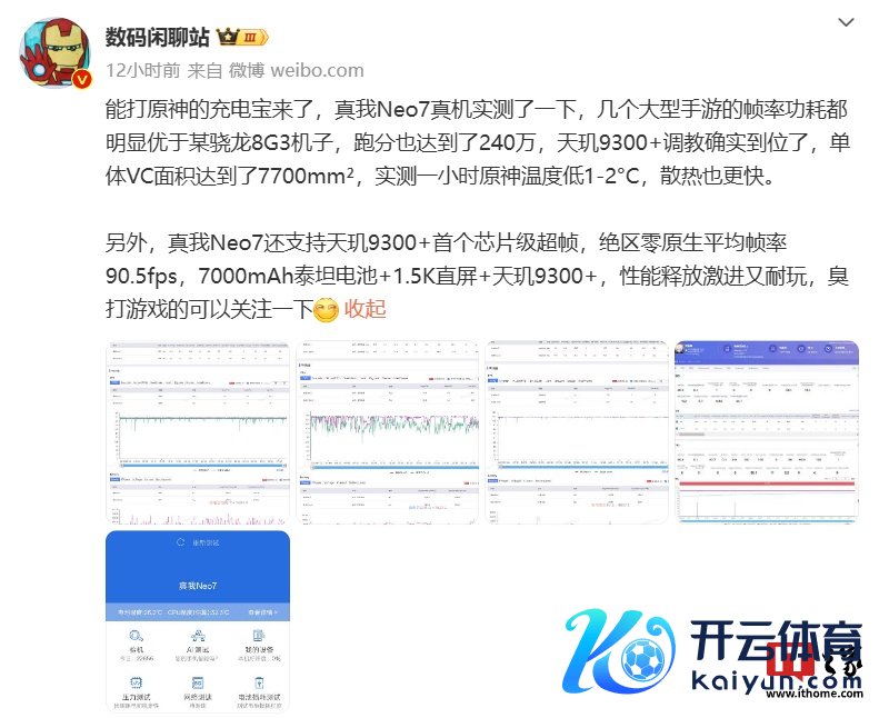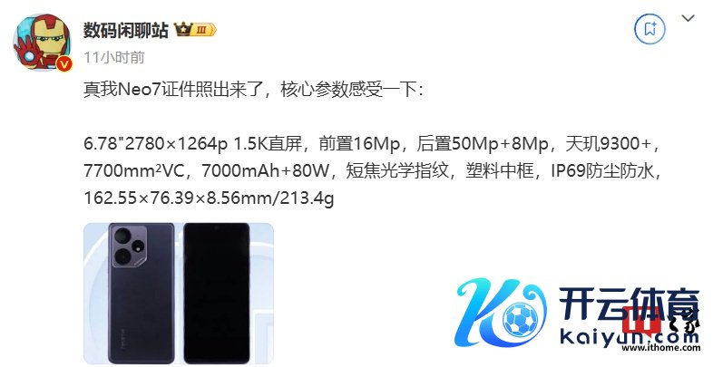 IT之家 12 月 4 日音讯云开体育,realme 真我 Neo7 手机将于 12 月 11 日 16:00 发布,新机细目搭载联发科天玑 9300+ 芯片、首发 7000mAh 泰坦电板、领有 7700mm² 单 VC 面积。 博主 @数码闲聊站 本日发文知道,realme 真我 Neo7 手机复古天玑 9300+ 首个芯片级超帧,游戏《绝区零》原生平均帧率 90.5fps。 据IT之家本日早些本事报说念,realme 真我 Neo7 手机已现身电信建设末端网,联系页面夸耀,realme