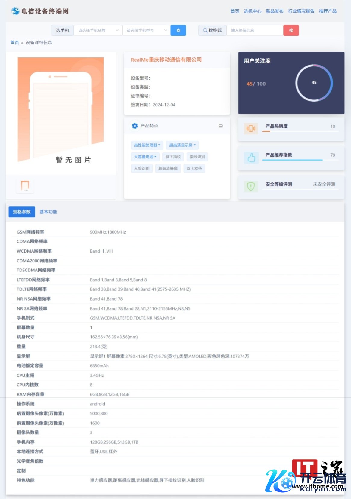 据IT之家本日早些本事报说念,realme 真我 Neo7 手机已现身电信建设末端网,联系页面夸耀,realme 真我 Neo7 手机尺寸为 162.55×76.39×8.56mm、重约 213.4g,配备 6.78 英寸 AMOLED 屏幕,差别率为 2780×1264,复古 10.7 亿色夸耀。