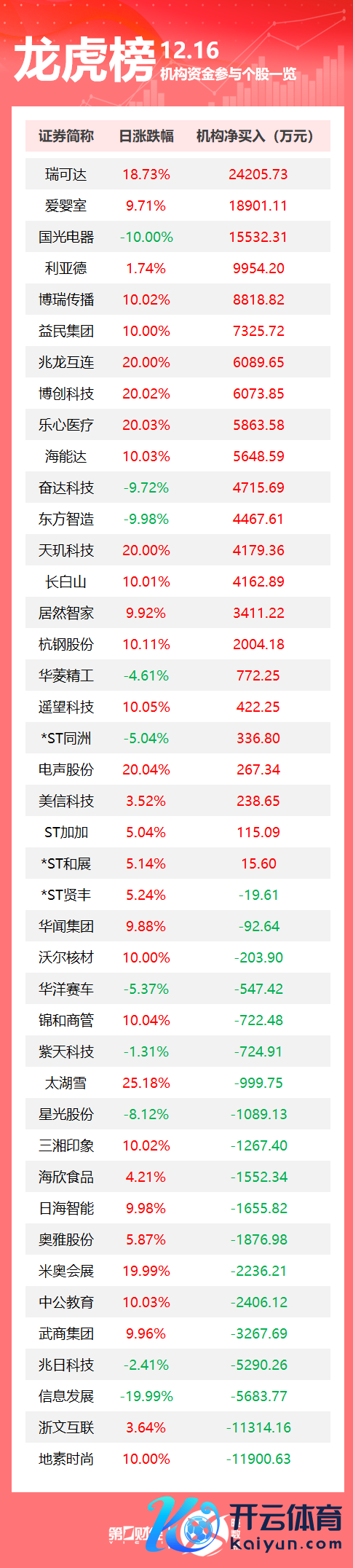 12月16日龙虎榜中,共42只个股出现了机构的身影,23只股票呈现机构净买入,19只股票呈现机构净卖出。当天机构净买入前三的股票分离是瑞可达、爱婴室、国光电器;当天机构净卖出前三的股票分离是地素前卫、浙文互联、信息发展。
