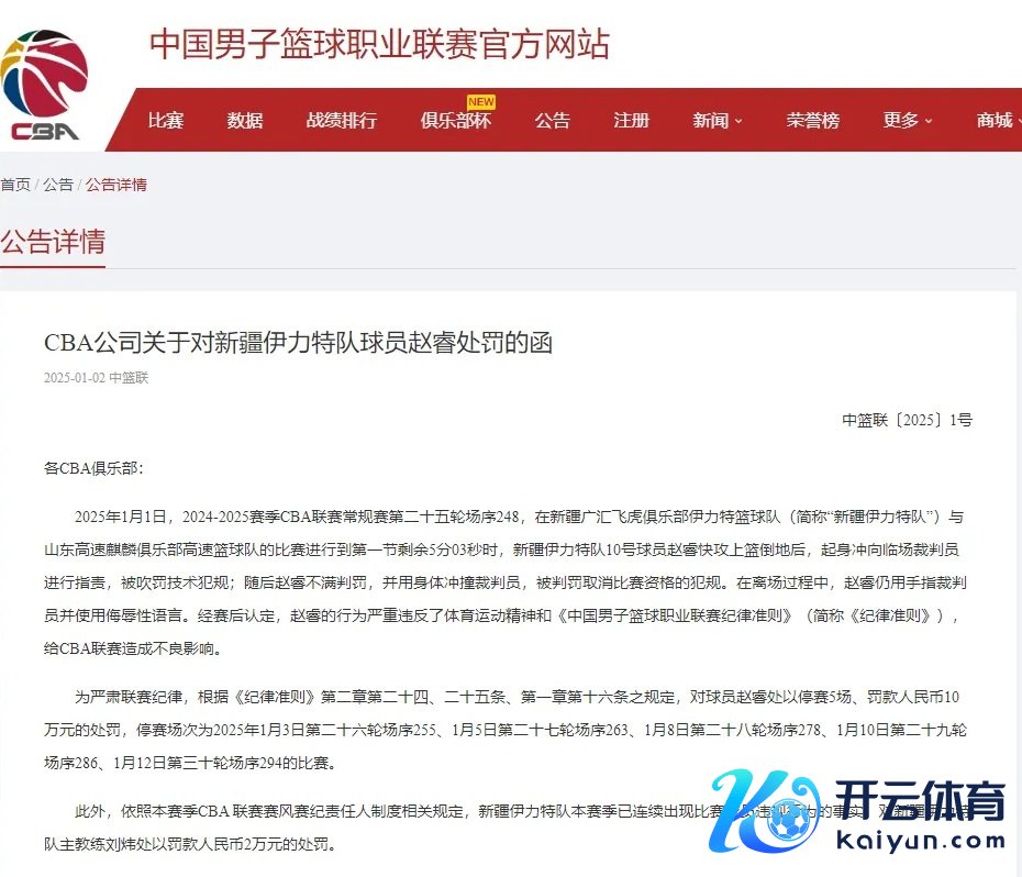 1月1日晚,CBA旧例赛,新疆在一场苦战中以107:111不敌山东,主场14连胜被敌手终结。 在比赛第一节还剩5分多钟时,赵睿上篮打进落地后合计我方被犯规但没得到叫子,他手指着左边线一端的裁判,裁判随后给了赵睿一个工夫犯规。后者特地动怒冲上来,竖起脊梁怒撞裁判,立时赵睿被终结出场。 1月2日云开体育,CBA官方秘书,因赵睿冲撞裁判,对其处以禁赛五场,罚金东谈主民币10万元的处罚。新疆主西宾刘炜负有连带背负,罚金东谈主民币2万元。 球员赵睿当日在个东谈主交代账号发文谈歉,全文如下: 在昨晚的比赛