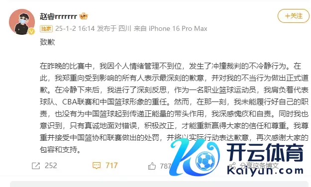 球员赵睿当日在个东谈主交代账号发文谈歉,全文如下: