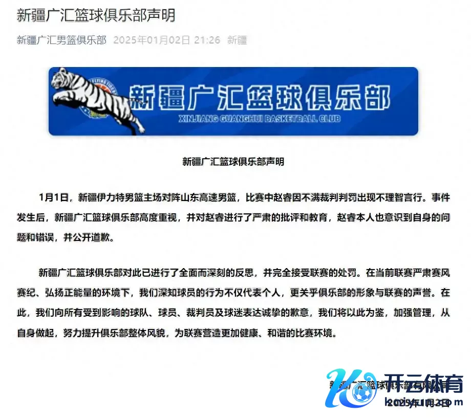 1月2日晚,新疆广汇篮球俱乐部发布声明:1月1日,新疆伊力特男篮主场对阵山东高速男篮,比赛中赵睿因不悦裁判判罚出现不睬智言行。事件发生后,新疆广汇篮球俱乐部高度深爱,并对赵睿进行了严肃的月旦和教会,赵睿本东谈主也意志到自己的问题和不实,并公开谈歉。