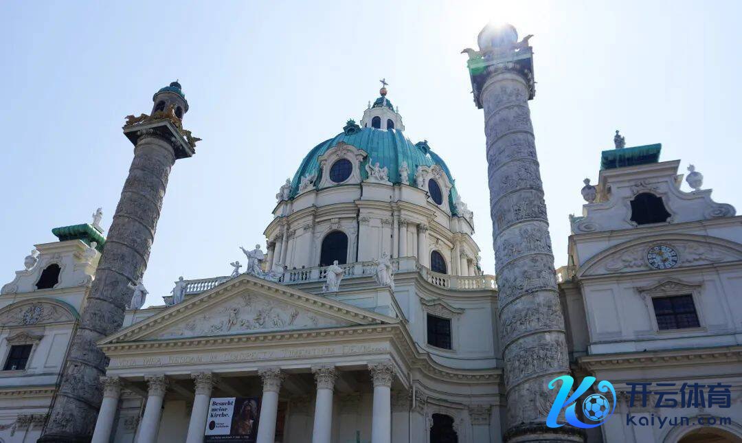 维也纳卡尔教堂:巴洛克作风教堂,正面呈现古希腊神庙作风,有山墙、门廊及科林斯式立面,两根高高的罗马式浮雕柱仿自罗马的图拉真胜利柱。两个边厢礼聘意大利文艺修起作风,搭配巴洛克式绿色穹顶与塔楼 ,外形宽裕动感,在阳光照射下非常小心。
