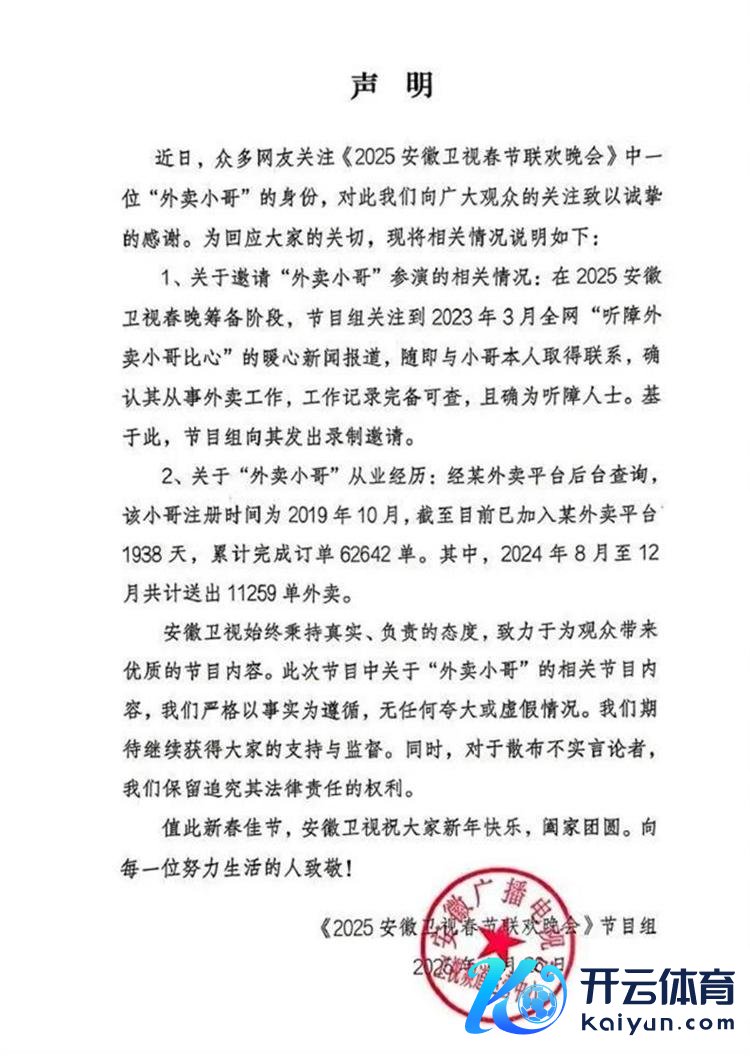 极目新闻驳倒员 吴双建开云体育(中国)官方网站 近日,安徽卫视春晚邀请来一位聋哑外卖小哥,干系词有网友以为这位外卖小哥的形象不合乎外卖员身份,激勉热议。1月26日晚,安徽卫视复兴称,其职责纪录完备可查,且确为听障东说念主士。(据1月26日彭湃新闻报说念) 安徽卫视公开复兴此事,且声明中罕有据守旧,证实流程访问,应该来说是巨擘的。 公私分明,一位听障东说念主士能当外卖员,要克服许多常东说念主念念象不到的贫苦,其自强学派的精神就值得笃信。2023年3月潇湘晨报曾报说念,年幼时他父亲升天,随着哥哥、