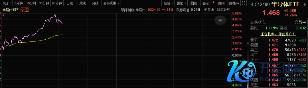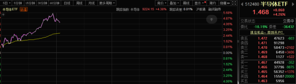 在光模块、PCB等受限的配景之下,芯片早盘蚁集爆发。中芯海外A股早盘大涨超7%,华虹半导体涨幅也一度扩大至7%,寒武纪一度大涨超4%;半导体ETF一度大涨近6%,科创AI ETF一度涨近4%。